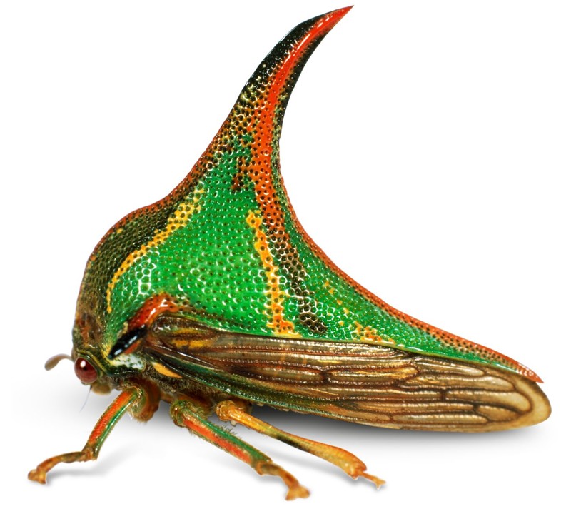 Treehoppers are masters of disguise, kitted out with odd back protrusions that can look like all kinds of thorns or leaves. When gathered on the stem of a plant, they are virtually indistinguishable from the flora that surrounds them. The thorn on their back can also work as a predator deterrent, as it would not be easy to swallow.