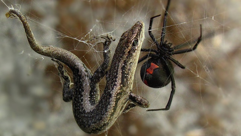 One of the most deadly spiders in Australia, it beat the black widow to the list due to its unusual hunting techniques. The redback builds an untidy web with many supporting lines gummed to the floor or walls, acting as spring trap mechanisms. Once an insect or even small lizard blunders into this line, they are trapped and the web springs, suddenly pulling the prey closer to the spider.