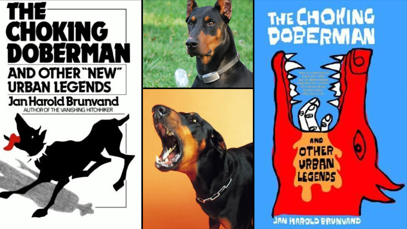 The Choking Doberman is a popular urban legend that originated from the United States. The tale follows a woman, who after going out for the evening with some friends, arrives home to discover her doberman choking in the hallway. Shocked and scared, she rushes her pet to the veterinarian, who advises the owner that he must perform a tracheotomy on the dog, and will call her once complete. During the surgery, the vet finds that the dog has been choking on three human fingers!