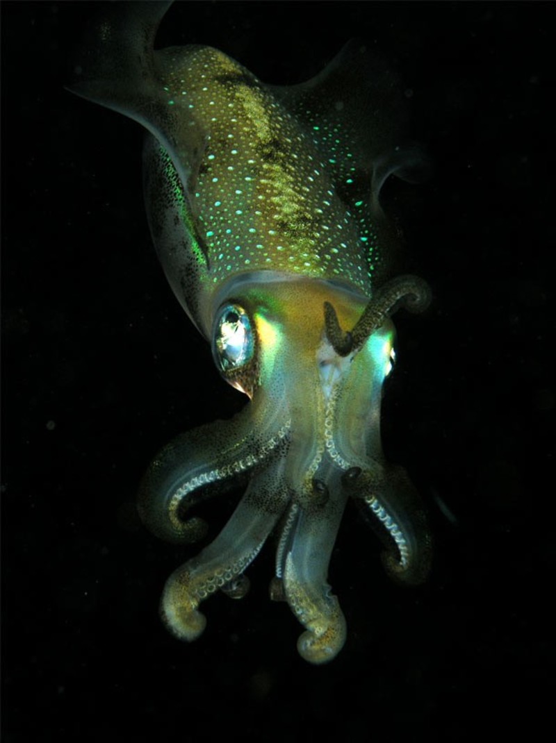 The vampire squid is a bizarre creature which produces some of its own light through glowing tentacle tips and spots on its sides. If disturbed, it can eject an ink which glows.