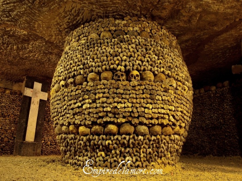 The Paris catacombs are a place of ghostly presence and a very eerie atmosphere; the walls are lined with human skulls throughout.